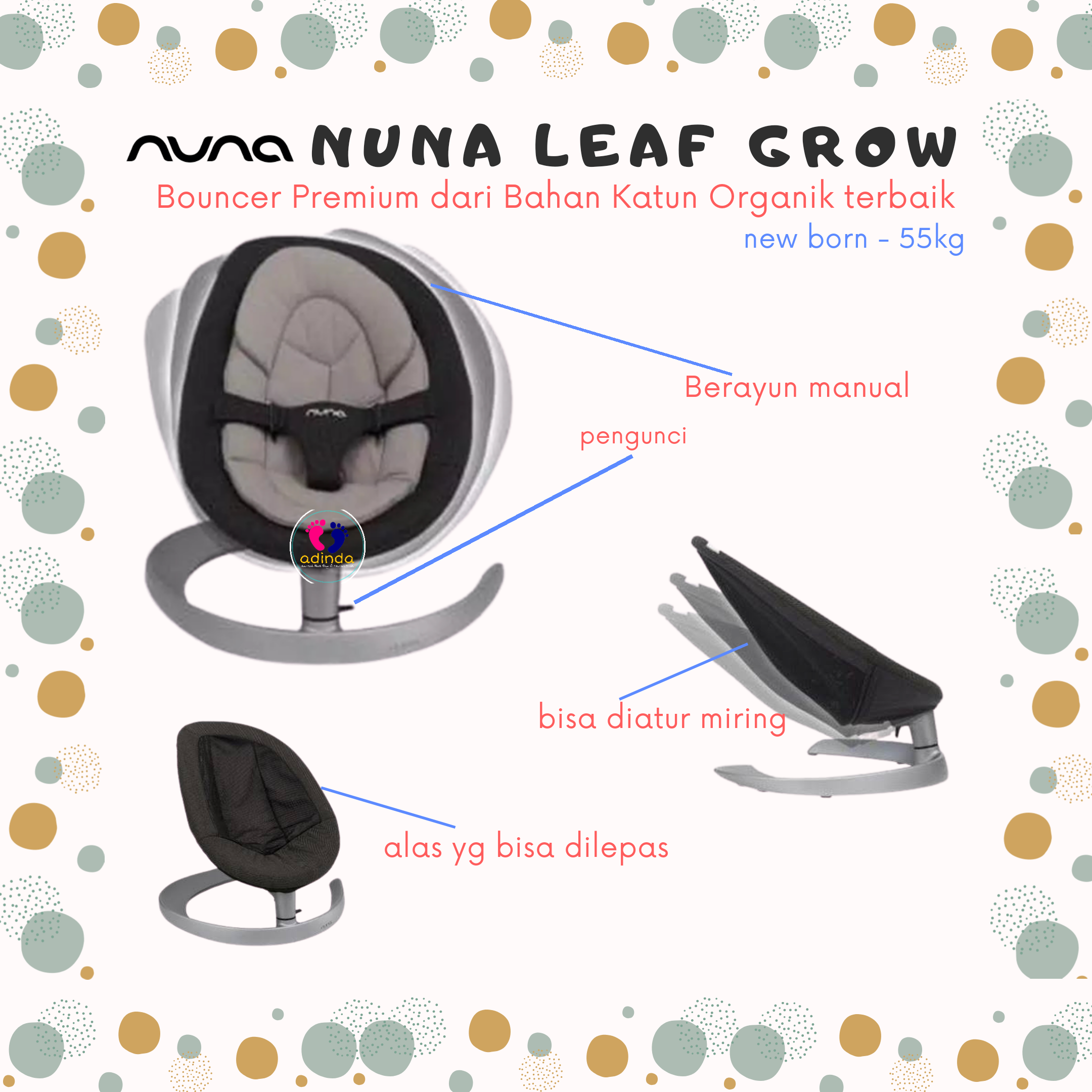 Dengan bentuk seperti daun dan dari material katun organik terbaik, rangka dari besi yg kokoh, dan hanya Nuna Grow yg bisa diatur KEMIRINGANNYA. .