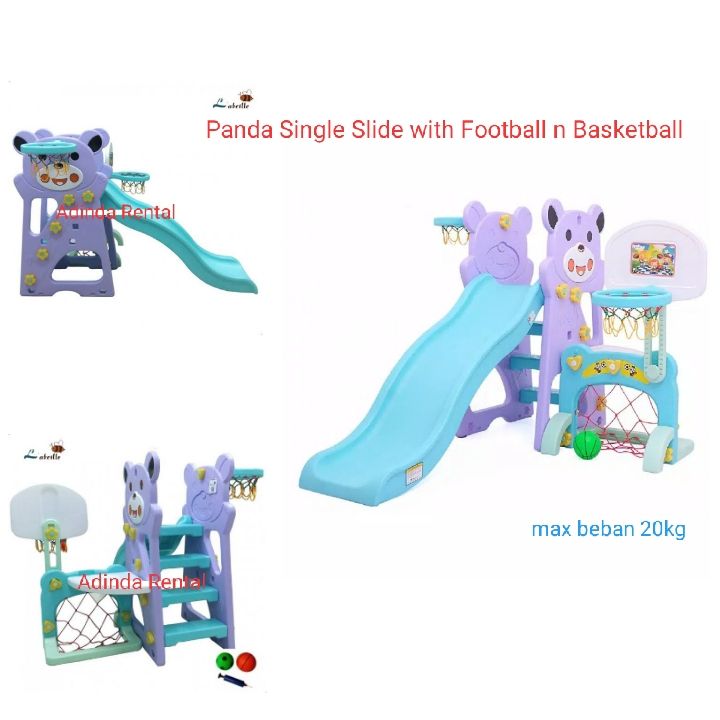 Labeille Panda Slide with Football & Basketball hadir dengan desain istimewa, berbentuk panda lucu , plastik tebal dan kokoh, anak tangga anti slip, perosotan lebar dan bergelombang untuk meluncur lebih aman.