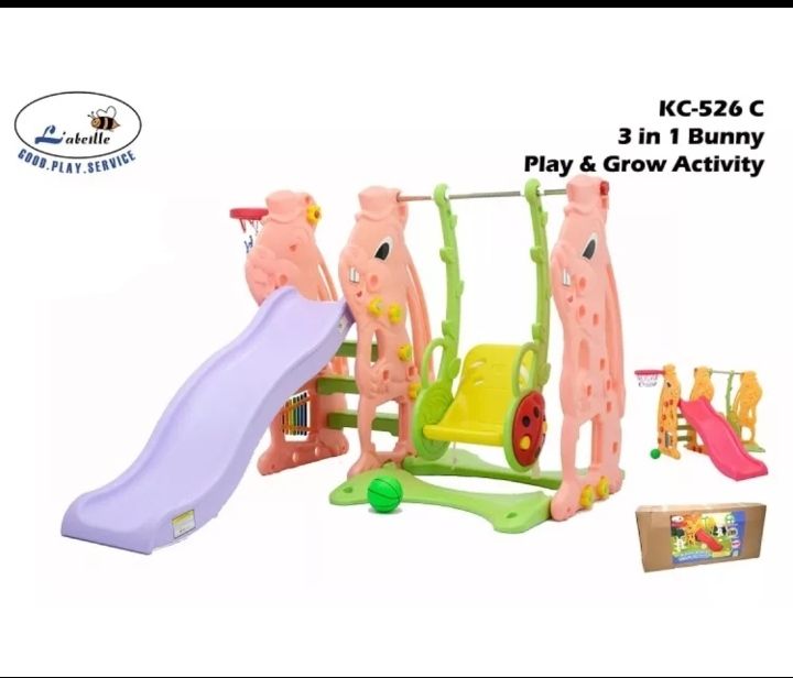 Perosotan Ayunan lucu berbentuk kelinci yang berwajah ramah, dilengkapi ring basket, xylophone. Perosotan lebar bergelombang dan 4-tangga non-slip, untuk bermain lebih aman. Ayunan dengan desain kepik lucu, perosotan dan ayunan dapat diatur 2 ketinggian mengikuti tumbuh anak.